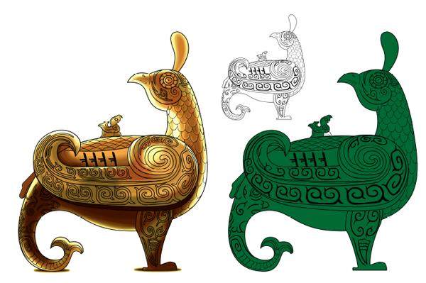 在新近发掘的安徽武王墩楚墓中,出土了一件造型别致、引人注目的“背兜”青铜壶。壶身呈瘦长颈、鼓腹型,腹部装饰着相互交错的多道弦纹,交接处还有形似纽扣的纹样,整体看来颇似“背兜”。这显然是模仿陶、木壶结绳背带的样子,湖北随州叶家山曾侯墓出土的“曾侯田壶”与它形似。这种类型的铜壶主要为军旅、田猎之用,壶颈部设有两个衔环耳,为便于出行携带。 你有没有发现?这件铜壶的盖顶上,铸造着一只展翅飞翔的小鸟,