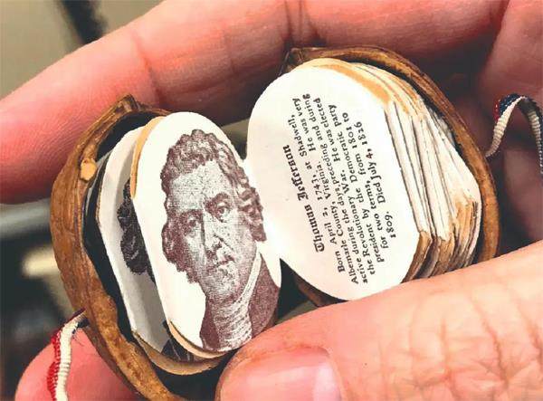 19世纪流行的趋势之一是将书籍放进坚果壳,例如这本托马斯·杰斐逊的袖珍传记 小人国书籍 人们一直对迷你事物颇为着迷,工匠们也乐于展示他们制作微型作品的技艺。同样,袖珍书也具有广泛的吸引力。例如,在美国总统富兰克林·罗斯福的藏书中,就有约750本袖珍书。 世界上最大的袖珍书主题博物馆在一个大多数人意料之外的地方,那就是阿塞拜疆的巴库袖珍书博物馆,收藏着从64个国家收集的6500余本袖珍
