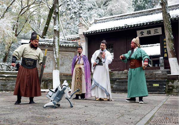 2026年1月1日,襄阳古隆中景区内,“诸葛亮”“刘备”“关羽”“张飞”演员与智能导览机器狗互动演出。图/视觉中国 河南南阳和湖北襄阳,开始合作了。 最近,南阳与襄阳跨省足球友谊赛在襄阳市体育场举行。赛事免票开放,吸引两地众多球迷到场观赛,襄阳队最终以2:0取胜。这场跨省城市之间的友谊赛,被视作两地文旅合作的又一举措。 在这场比赛之前,南阳文旅和襄阳文旅的官方账号,还发布了共创视频,邀请网友