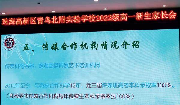 青鸟北附2022级高一新生家长会上的机构介绍。图/受访者提供 近日,多名广东珠海家长向《中国新闻周刊》反映,子女就读珠海市高新区青鸟北附实验学校高中部(下称“青鸟北附”)期间,遭遇该校合作培训机构设下的升学骗局。 据家长李静介绍,经初步统计,仅她孩子所在的2025届某班级,就有37个家庭被骗,涉案金额达800余万元。 李静讲述,在2022年秋季新生家长会上,青鸟北附老师宣称,学校特色传媒班