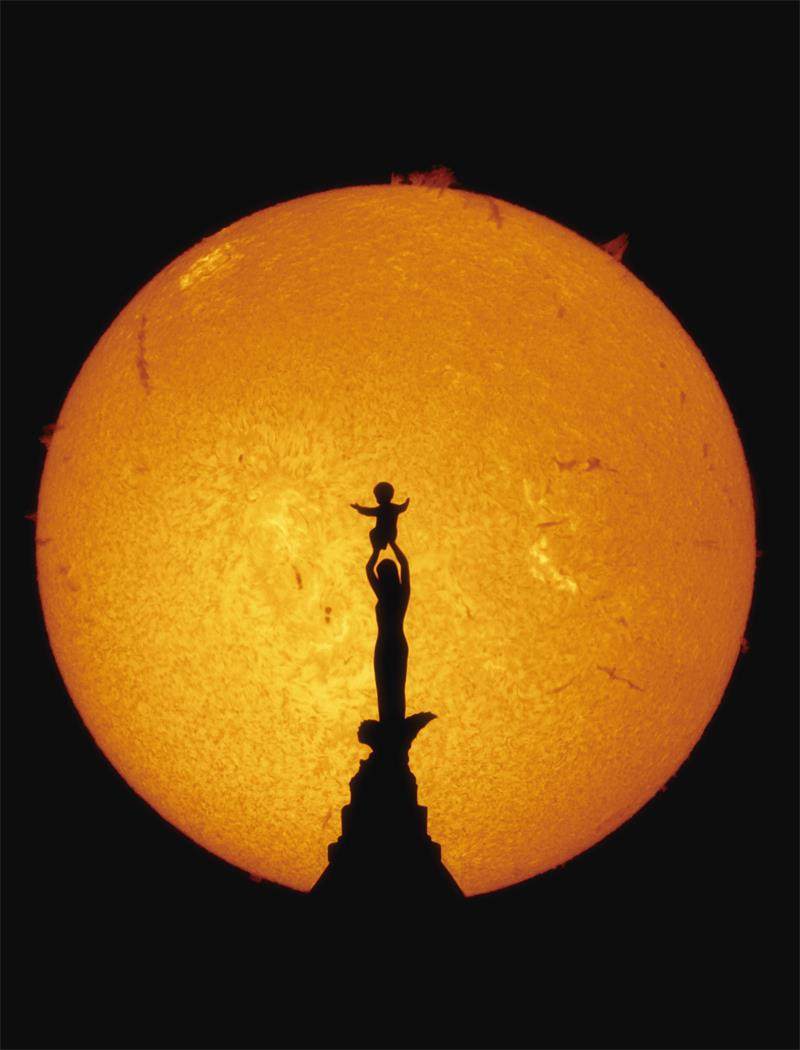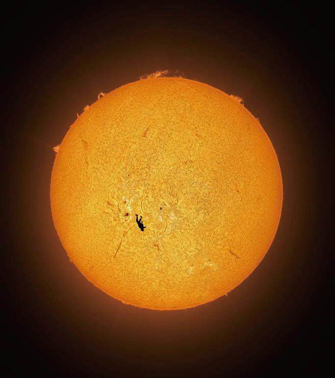 伊卡洛斯的坠落 跳伞运动员加布里埃尔·C.布朗在太阳色球层的映衬下呈现出剪影效果。 一次大胆的创意:将跳伞与天体摄影结合 在摄影艺术不断突破的今天,如何将常规的题材与极致的自然现象结合,成为许多摄影师思考的方向。安德鲁·麦卡锡,这位以拍摄太阳和深空天体闻名的摄影师,一直热衷于探索太阳色球层的细腻光影。他的好友加布里埃尔·C. 布朗则是一名资深跳伞运动员,同时也是颇受欢迎的视频博主。两人在一次