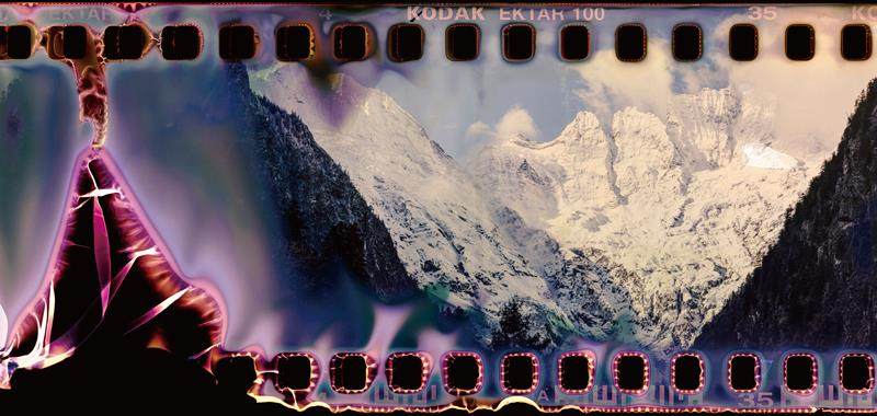胡为一,《侵蚀—五冠峰 No.1》,2022 年。数码微喷、迪亚塞克装裱、实木框,93厘米×200厘米。 图片由艺术家提供。 胡为一,《侵蚀—阿布吉措 No.9》,2021年 数码微喷、迪亚塞克装裱、实木框,73厘米×157厘米。图片由艺术家提供。 山川、胃酸、侵蚀 在当代艺术中,胡为一的《侵蚀》系列完成了一次对影像本质的深刻叩问。这位年轻艺术家选择将自身转化为一个活的化学反应装置——他把拍